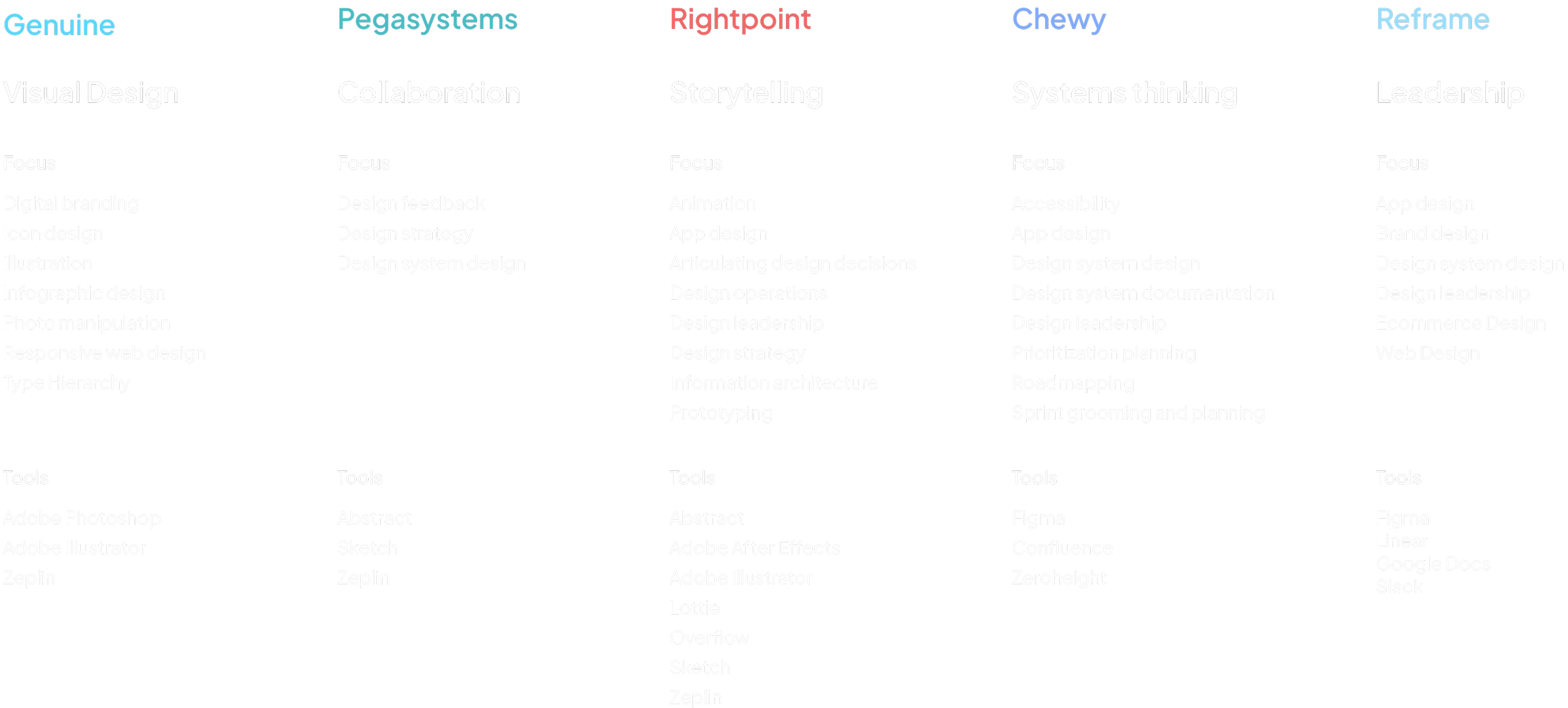 I’ve worked across startups and enterprises, leading design efforts at companies like Reframe, Chewy, Rightpoint, Pegasystems, and Genuine. My approach blends strong visual design with systems thinking to create solutions that meet user needs, drive business outcomes, and support engineering teams more effectively.